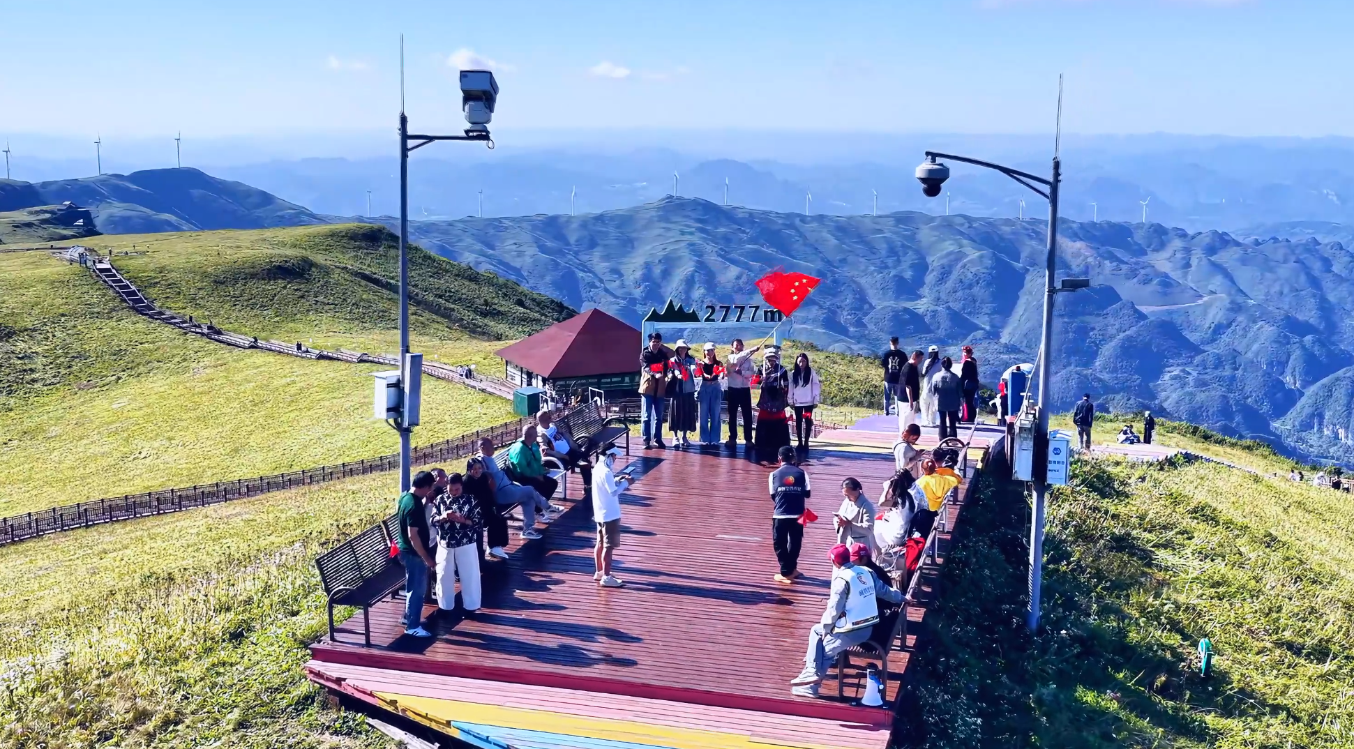 오전 8시경, 자이위핑 경구의 관광객들이 질서 있게 입장하고 있었으며, 관광객들은 너도나도 케이블카나 관광차로 갈아타고 산정으로 향하고 있었습니다. 비록 절정의 꽃철은 지났지만, 수만 묘에 이르는 야생 부추 초원은 여전히 푸르싱싱한 기운을 띠며, 마치 거대한 비단이 하늘로 펼쳐진 듯하며, 멀리 펼쳐진 구름 바다와 어우러져 절경을 이루고 있었습니다. 나무 데크 길 위에서는 부모와 자녀가 함께하는 가족들, 그리고 사진 애호가들이 끊임없이 이어졌으며, 모두 카메라를 들고 '만봉장운하, 인재운상행'이라는 절경을 영원히 간직하고 있었습니다.